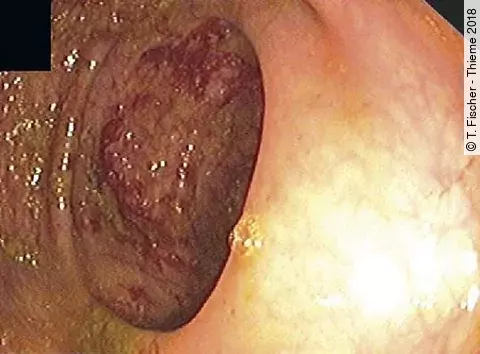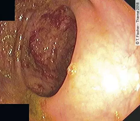 Histologisch imponiert das Bild einer Zöliakie im Duodenum sowie einer lymphozytären Kolitis bis in das terminale Ileum und eine mikroskopische Kolitis. Bei negativem Antikörpernachweis für eine Zöliakie ergibt sich die Verdachtsdiagnose einer Medikamentennebenwirkung.