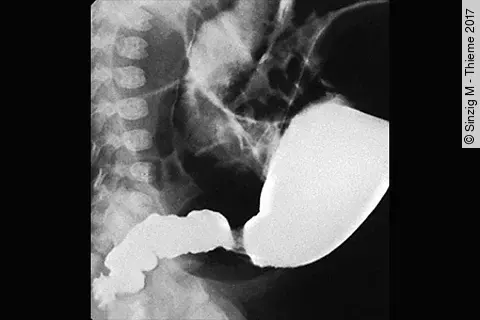 Sie untersuchen einen 5 Wochen alten Säugling mit stark aufgeblähtem Bauch und Obstipationsproblemen von Geburt an. Während der 5 Wochen erbrach der Säugling zudem häufiger Galle. Nach Kolonkontrasteinlauf (Linksseitenlage) erhalten Sie folgendes Bild. Was sehen Sie?