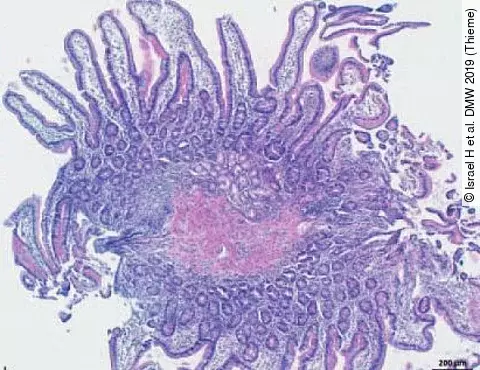 Histologisch imponiert das Bild einer Zöliakie im Duodenum sowie einer lymphozytären Kolitis bis in das terminale Ileum und eine mikroskopische Kolitis. Bei negativem Antikörpernachweis für eine Zöliakie ergibt sich die Verdachtsdiagnose einer Medikamentennebenwirkung.
