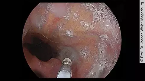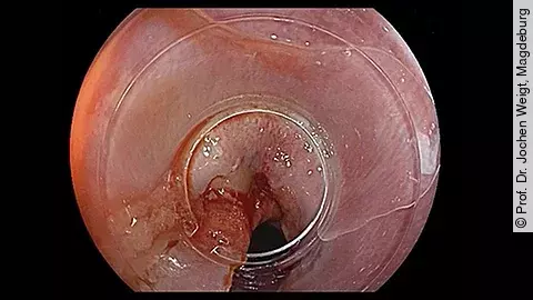 Ein 45-jähriger Mann mit morbider Adipositas wurde 7 Tage vor der Vorstellung zur Endoskopie operiert. Bei ihm erfolgte eine Sleeve-Resektion des Magens mit Entfernung der großen Kurvatur. Im routinemäßig durchgeführten Breischluck war eine Leckage im Bereich des gastroösophagealen Übergangs nachweisbar.