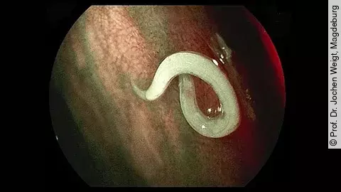 Bei einer Nachsorgekoloskopie erregte folgender Fall Aufmerksamkeit: Ein 47-jähriger Mann mit positiver Familienanamnese für kolorektale Karzinome in der Vergangenheit kam zur Verlaufskontrolle. Er war völlig symptomlos. Doch dann die Überraschung: Beim Rückzug fanden sich weißliche Würmer im Kolon.